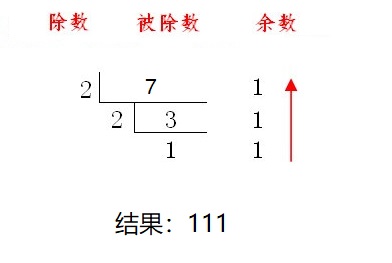 举个例子,将十进制数7转换成二进制数,我们需要把7不断除以2,得到商和余数,将商继续除以2,直到商为0。最后将所有余数倒序排列,得到数就是转换结果。
