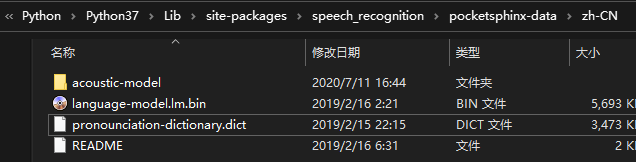 下载完成后解压,找到python的安装目录,进入Lib\site-packages\speech_recognition\pocketsphinx-data目录。