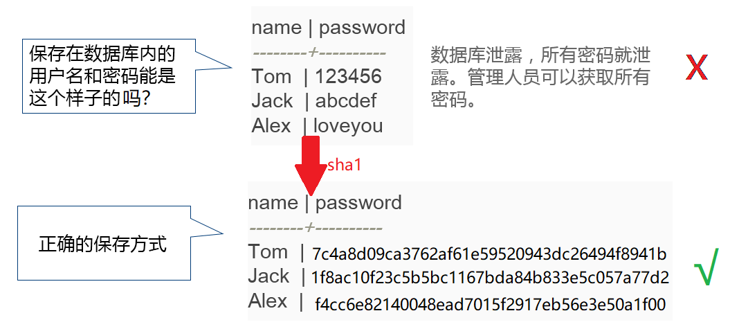 那么使用哈希算法,只储存用户密码的摘要,当用户登录时,首先计算用户输入的明文密码的摘要,和数据库存储的数据进行对比,即可验证密码是否正确。